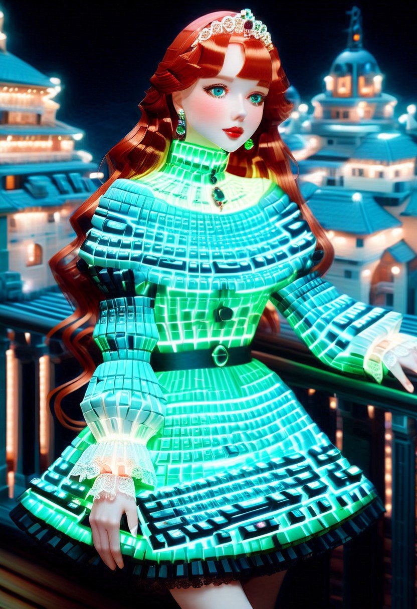 (RGB Keyboard themed:1.6), (masterpiece),(castle), (pale skin), nobody_tall, hands hidden, (grace lady), jewelry-tiara, //ruby_deep-orange hair, long_wavy hair//, //shiny-green eyes//, nose, (shiny lip), closed mouth, //long lace dress//, //white garter, elbow gloves, royal_cape//, looking at viewer, standing, close-up, censored, puffy sleeves, closed dress, beautiful high-neck top, fully dressed, scenery, balcony, fionaxl, RetroChicNostalgia, TimelessNostalgicStyle, NostalgicChicTone, OldSchoolChic, NostalgicElegance, VintageFashionNostalgia, RetroNostalgicChic, VintageWarmthAesthetic, RetroNostalgicFlair