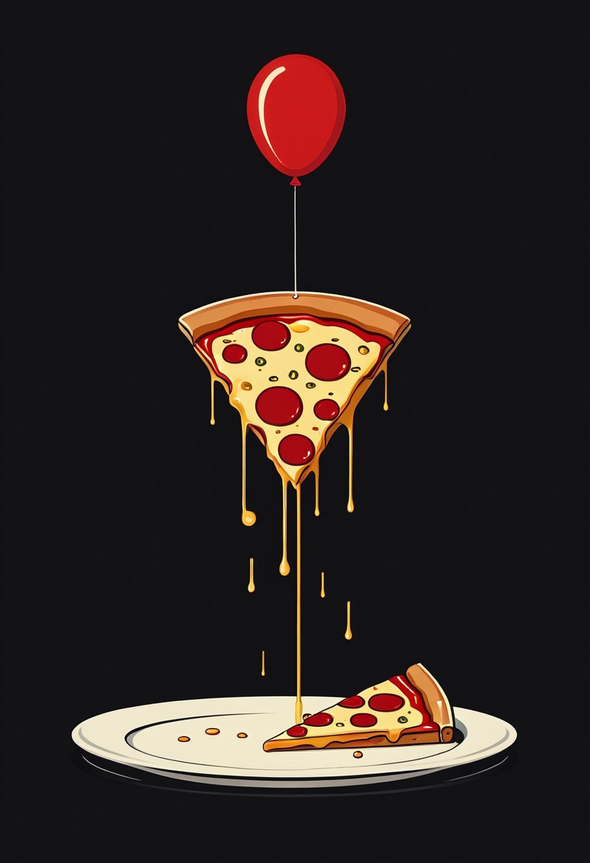 A slice of pizza dripping with cheese, but illustrated like a piece of fine art, minimalistic horror, dark background, eerie atmosphere, surreal illustration, unsettling calm, big-eyed character, balloon symbolism, horror aesthetic, monochrome with red contrast, gothic minimalism