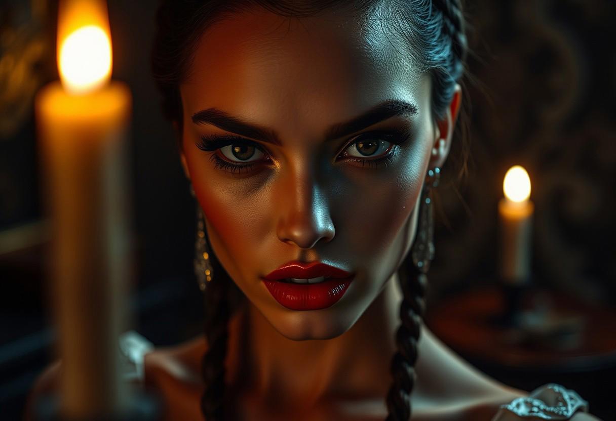 Medium shot, Photoportrait glamorous young woman exuding "Femme Fatale" vibes, seductive sexy and sultry, refined aristocratic features, thin nose, (very large very plump Full lips) like the embodiment of temptation and dreams, expressive bright smokey eyes with thick lashes, ((narrow arched eyebrows)), piercing gaze, (polished porcelain delicate smooth matte skin), braids, vintage glam makeup, Candid Angle, dark background, candle, complex dynamic dark ambient, expressive pose, intricate hyperrealistic depiction, eccentric --chaos 69, Symmetry, (Masterpiece, photorealistic, photorealism, best quality, ultra-detailed), cinematic light, production cinematic character render, volumetric light, Canon kinophoto lens, Professional shot on DSLR 64 megapixels, (Photorealism, Ultra-Realism, Extremely High Detailed), ultra-thin textures, ultra-fine textures, hyperrealism, hyperdetailedness, golden ratio, 16k UHD, HDR,