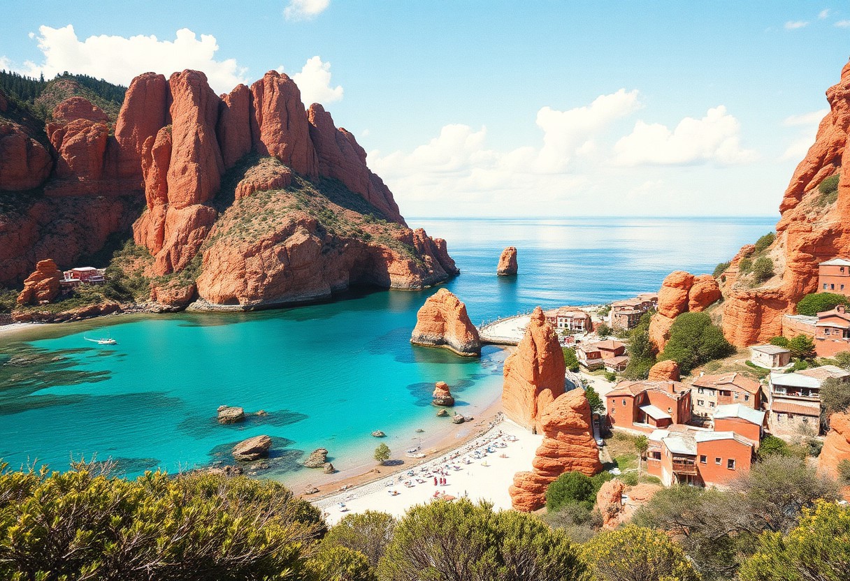 in the style of ck-mgs, nistyle, Special Ink-drawing mode, intricate linework with expressive contrasts, Mh1$AgThS2, Inkplash art on rice paper, An idyllic coastal village with striking red rock formations set against the backdrop of crystal-clear turquoise waters. The atmosphere is serene and sunlit, with soft white clouds dotting the sky, offering a peaceful retreat amidst nature's beauty.