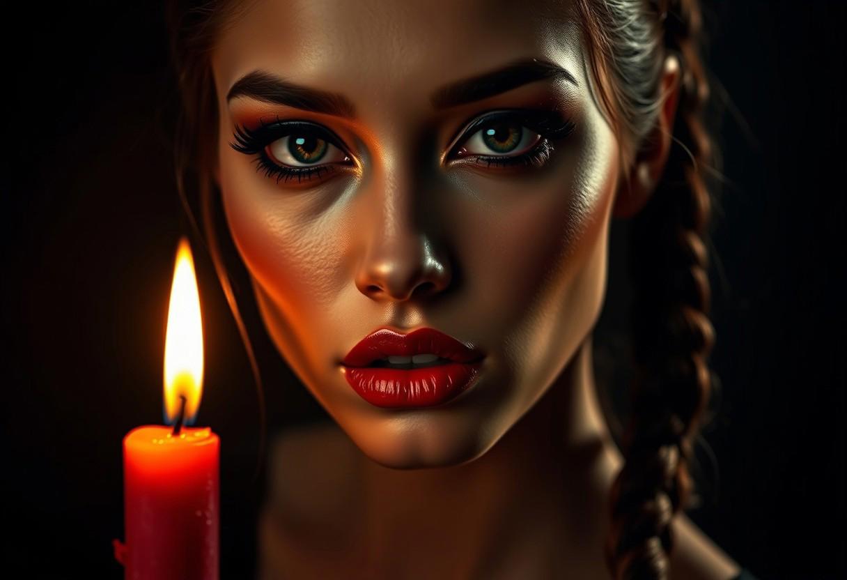 Medium shot, Photoportrait glamorous young woman exuding "Femme Fatale" vibes, seductive sexy and sultry, refined aristocratic features, thin nose, (very large very plump Full lips) like the embodiment of temptation and dreams, expressive bright smokey eyes with thick lashes, ((narrow arched eyebrows)), piercing gaze, (polished porcelain delicate smooth matte skin), braids, vintage glam makeup, Candid Angle, dark background, candle, complex dynamic dark ambient, expressive pose, intricate hyperrealistic depiction, eccentric --chaos 69, Symmetry, (Masterpiece, photorealistic, photorealism, best quality, ultra-detailed), cinematic light, production cinematic character render, volumetric light, Canon kinophoto lens, Professional shot on DSLR 64 megapixels, (Photorealism, Ultra-Realism, Extremely High Detailed), ultra-thin textures, ultra-fine textures, hyperrealism, hyperdetailedness, golden ratio, 16k UHD, HDR,