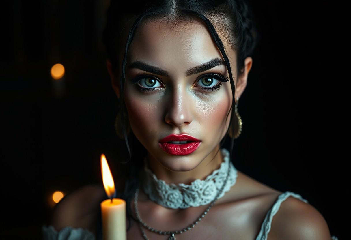 Medium shot, Photoportrait glamorous young woman exuding "Femme Fatale" vibes, seductive sexy and sultry, refined aristocratic features, thin nose, (very large very plump Full lips) like the embodiment of temptation and dreams, expressive bright smokey eyes with thick lashes, ((narrow arched eyebrows)), piercing gaze, (polished porcelain delicate smooth matte skin), braids, vintage glam makeup, Candid Angle, dark background, candle, complex dynamic dark ambient, expressive pose, intricate hyperrealistic depiction, eccentric --chaos 69, Symmetry, (Masterpiece, photorealistic, photorealism, best quality, ultra-detailed), cinematic light, production cinematic character render, volumetric light, Canon kinophoto lens, Professional shot on DSLR 64 megapixels, (Photorealism, Ultra-Realism, Extremely High Detailed), ultra-thin textures, ultra-fine textures, hyperrealism, hyperdetailedness, golden ratio, 16k UHD, HDR,