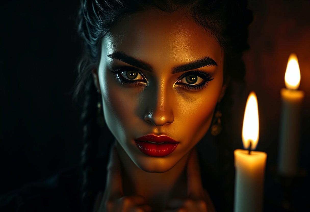 Medium shot, Dark Photoportrait glamorous young woman exuding "Femme Fatale" vibes, ((seductive sexy and sultry)), refined aristocratic features, ((thin nose)), (very large very plump Full lips) like the embodiment of temptation and dreams, expressive bright smokey eyes with thick lashes, ((narrow arched eyebrows)), piercing gaze, ((polished porcelain delicate smooth matte skin)), braids, vintage glam makeup, Candid Angle, dark background, candle, complex dynamic dark ambient, expressive pose, intricate hyperrealistic depiction, eccentric --chaos 69, Symmetry, (Masterpiece, photorealistic, photorealism, best quality, ultra-detailed), cinematic light, production cinematic character render, volumetric light, Canon kinophoto lens, Professional shot on DSLR 64 megapixels, (Photorealism, Ultra-Realism, Extremely High Detailed), ultra-thin textures, ultra-fine textures, hyperrealism, hyperdetailedness, golden ratio, 16k UHD, HDR,