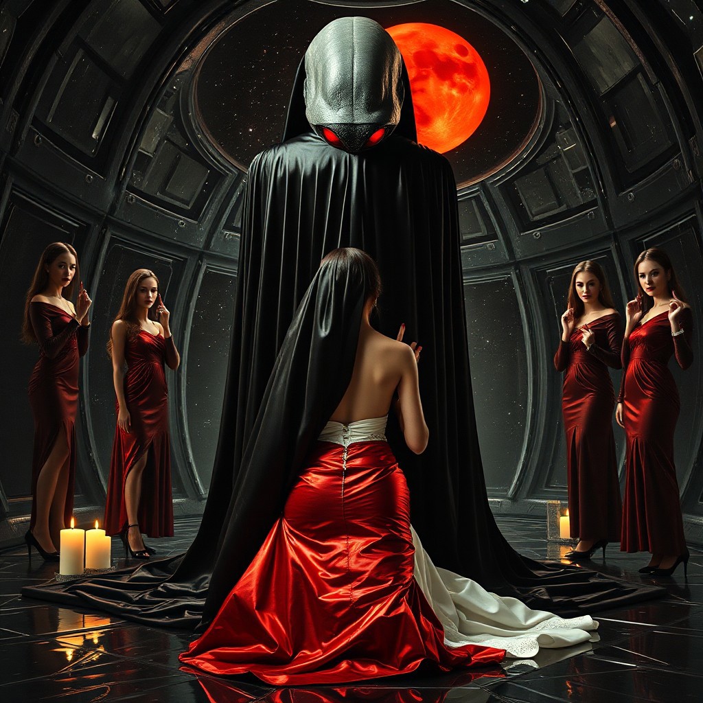 high-society elegant slender norvegian rich innocent young bride kneeling at whorish red glossy foil pillow from behind. She is ensnared by a towering, gray human-like alien, draped in a long, glossy black slime cloak, its eyes gleaming red with an otherworldly intensity. its hands fastens steel slave collar on her. Surrounded by strict ladies wearing glossy satin dominatrix attire and glossy high heels, holding candles. weird wet-look black slime walls and floor, colossus observation blister to outer space full of stars, bright red moon, vintage-inspired makeup, long hairs, ultra thin waist, evil grin, porcelain skin, lipstick, red nails, in the style of a haunting, retro-futuristic 1950s sci-fi nightmare, horror, alien space base,,