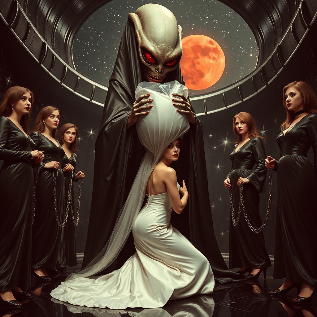 high-society elegant slender norvegian rich innocent young bride kneeling from behind. She is ensnared by a towering alien, draped in a long, glossy black slime cloak, its eyes gleaming red with an otherworldly intensity. its hands encasong her head in transparent giant slime sack. Surrounded by strict ladies wearing glossy satin long dominatrix gowns and glossy high heels, holding slave chains and collars. weird wet-look black slime walls and floor, colossus observation blister to outer space full of stars, bright red moon, vintage-inspired makeup, long hairs, ultra thin waist, evil grin, porcelain skin, lipstick, red nails, in the style of a haunting, retro-futuristic 1950s sci-fi nightmare, horror, alien space base,,