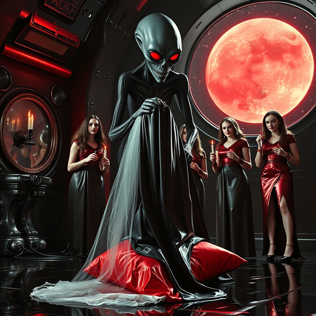high-society elegant slender norvegian rich innocent young bride kneeling at whorish red glossy foil pillow from behind. She is ensnared by a towering, gray human-like alien, draped in a long, glossy black slime cloak, its eyes gleaming red with an otherworldly intensity. its hands fastens steel slave collar on her. Surrounded by strict ladies wearing glossy satin dominatrix attire and glossy high heels, holding candles. weird wet-look black slime walls and floor, colossus observation blister to outer space full of stars, bright red moon, vintage-inspired makeup, long hairs, ultra thin waist, evil grin, porcelain skin, lipstick, red nails, in the style of a haunting, retro-futuristic 1950s sci-fi nightmare, horror, alien space base,,