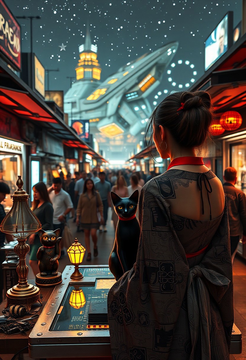 Setting is a futuristic cyberpunk street market at night, the market is comprised of street vendors selling robot parts, food, weapons, and robot pets. People wearing futuristic cyberpunk clothing are walking through the street market shopping and eating, A sleek black cat with red collar sits on a cluttered metal riveted desk with transparent top and micro-LED lighted computer components visible inside, On the desk is an ebony and gold maneki neko statue and a classic ornate art deco lamp, (((a beautiful woman, 24 years old, is standing in the foreground facing the viewer))), the sleek black cat with red collar is sitting on the desk and watching the people walking by in the busy street market, the woman is dressed in futuristic cyberpunk Japanese style kimono-style clothing that are sexy and Japanese classic aesthetic. An enormous art deco inspired starship with futuristic lighting and an enormous space station are visible in the background among the stars, The woman's hair is elegantly tied up with a ribbon. Artistic cyberpunk, dynamic perspective, (((overall architectural aesthetic is Art Deco Cyberpunk))). Epic image that elicits a feeling of wonder and awe, part of the interior is visible,