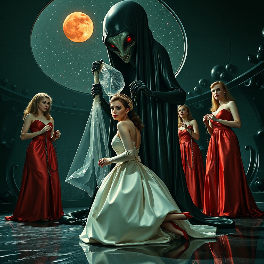 high-society elegant slender norvegian rich innocent young bride kneeling from behind. She is ensnared by a towering alien, its draped in a long, glossy black slime cloak, its eyes gleaming red with an otherworldly intensity. its hands pulling giamt transparent jelly sack on her head. Surrounded by arrogant ladies wearing glossy satin long full skirt gowns and glossy high heels, holding slave chains reatraining her. weird wet-look black slime walls and floor, colossus observation blister to outer space full of stars, bright red moon, vintage-inspired makeup, long hairs, ultra thin waist, evil grin, porcelain skin, lipstick, red nails, in the style of a haunting, retro-futuristic 1950s sci-fi nightmare, horror, alien space base,,