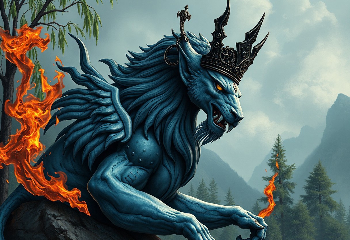 "Create an ultramarine and black centered, highly detailed, golden ratio composition. Feature a zentaur in a regal pose with a prince crown of black gears. Incorporate a fire lion and a forest of willow trees. This should be a full body portrait with intricate details, aiming for a lifelike result. Draw inspiration from artists like Tooth Wu, wlop, and beeple, and consider a character concept art or film still approach."