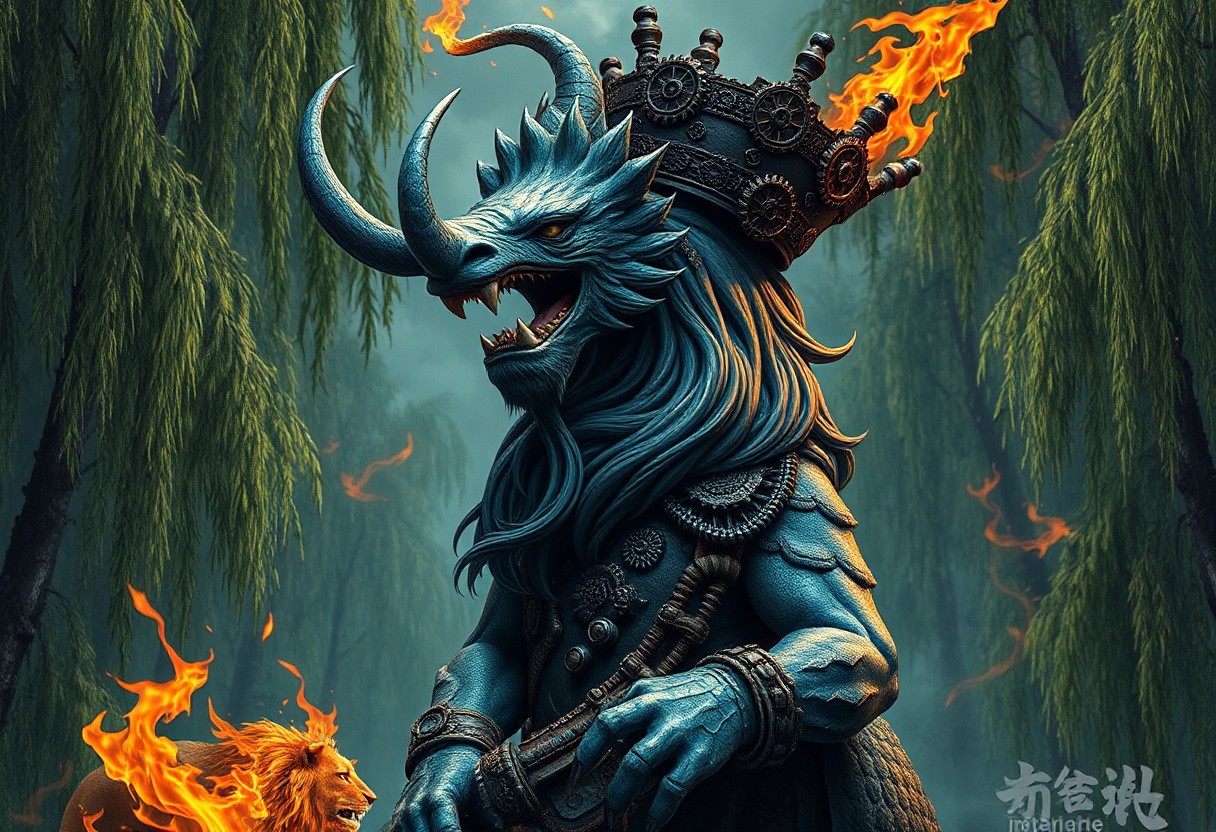 "Create an ultramarine and black centered, highly detailed, golden ratio composition. Feature a zentaur in a regal pose with a prince crown of black gears. Incorporate a fire lion and a forest of willow trees. This should be a full body portrait with intricate details, aiming for a lifelike result. Draw inspiration from artists like Tooth Wu, wlop, and beeple, and consider a character concept art or film still approach."