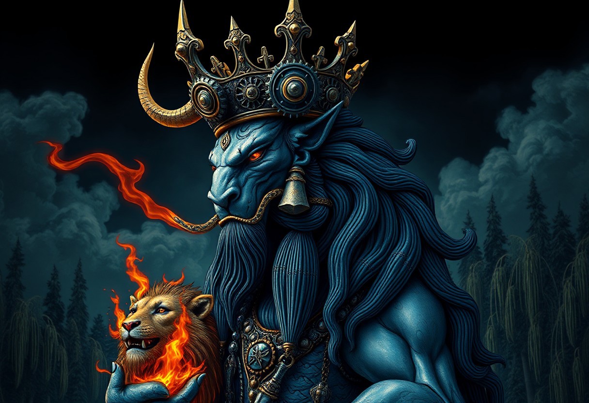 "Create an ultramarine and black centered, highly detailed, golden ratio composition. Feature a zentaur in a regal pose with a prince crown of black gears. Incorporate a fire lion and a forest of willow trees. This should be a full body portrait with intricate details, aiming for a lifelike result. Draw inspiration from artists like Tooth Wu, wlop, and beeple, and consider a character concept art or film still approach."
