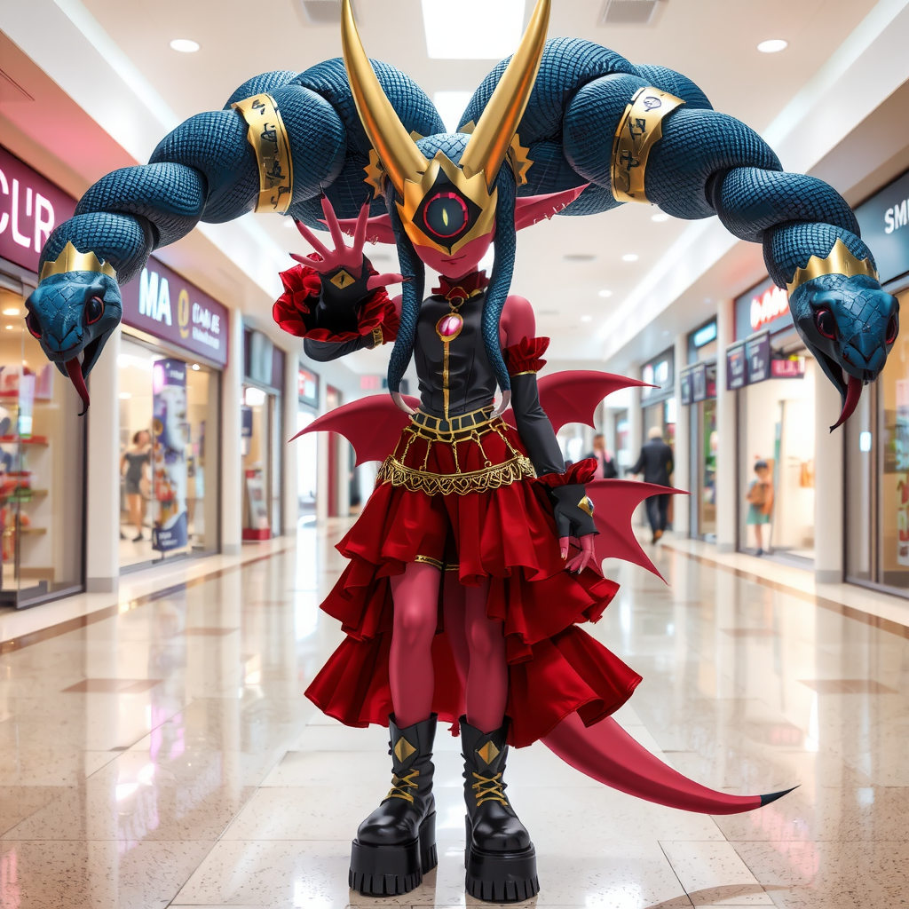 This image is a cinematic film still from a live action movie, featuring Medusamon, a humanoid with a predominantly pink and black color scheme. She has pink skin, pointy ears,black twintail hair made of snakes, a single red eye and golden mask with with two horns. Each of her snakes has a golden crown on its head. She is wearing a black shirt with detached sleeves and a pendant and a red frilled dress with her tail poking through it. She has red dragon wings on her lower back and is wearing platform boots and fingerless gloves with eyes on the palms. She is reaching out toward the veiwer with one of her hands while standing with her snake hair to her sides. Medusamon is standing in the middle of an empty shopping mall. The overall style is highly detailed and realistic, reminiscent of a high quality professional photograph.