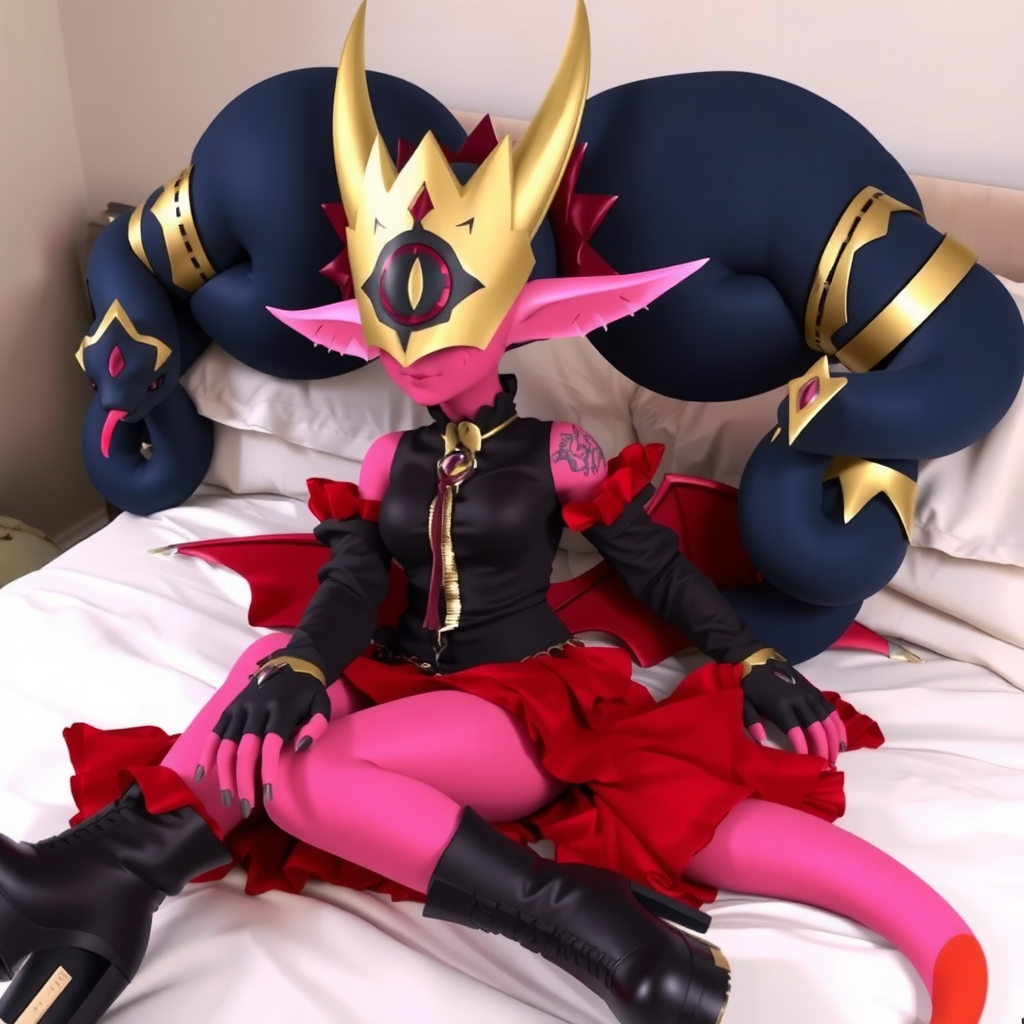 photo of Medusamon, a humanoid with a predominantly pink and black color scheme. She has pink skin, pointy ears,black twintail hair made of snakes, a single red eye and golden mask with with two horns. Each of her snakes has a golden crown on its head. She is wearing a black shirt with detached sleeves and a pendant and a red frilled dress with her single red tail poking through it. She has red dragon wings on her lower back and is wearing platform boots and fingerless gloves with eyes on the palms. She is laying on a bed in a bedroom. The image is a live action still from a movie.