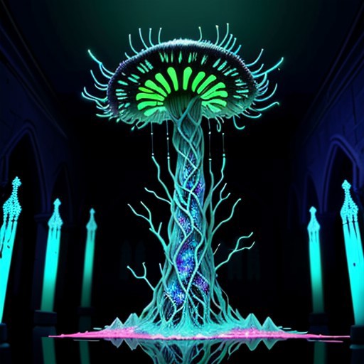 Create a 3 minutes video for YouTube about Kleptoparasi King of all Calamities An eerie mushroom cathedral, its bioluminescent interior casting a soft, ethereal glow. The walls and ceiling are lined with cracked, glowing blue veins that mimic the intricate patterns of shattered glass, hinting at the presence of archaea and bacteria. In the center of this mystical space, a Kleptoparasi is a mixes of archaea/bacteria/mushroom/parasite/fungi a living virse humanoid entity, stands tall with its translucent bioluminescence glass like skin revealing a complex network of neon glowing veins in the same electric blue hue. Its eyes are two piercing dots of light that seem to pulse in sync with the surrounding fungal structure. The creature wears tattered robes made from what appear to be discarded membrane scraps, giving it an otherworldly, yet strangely organic appearance. As it steps into the heart of the cathedral, its veins flare up in a symphony of colorful flames—purple, teal, yellow, green, red, orange, and pink—manifesting its Kleptoparasitism Striker form. Its hands are now engulfed in a fiery dance of multiple hues, each flame representing a different type of energy stolen from various hosts. The parasite's posture is one of determination, its eyes focused on the horizon of the mushroom forest beyond, symbolizing its relentless pursuit of new life to infect and adapt to. The scene is a mesmerizing blend of beauty and horror, showcasing the delicate balance of life