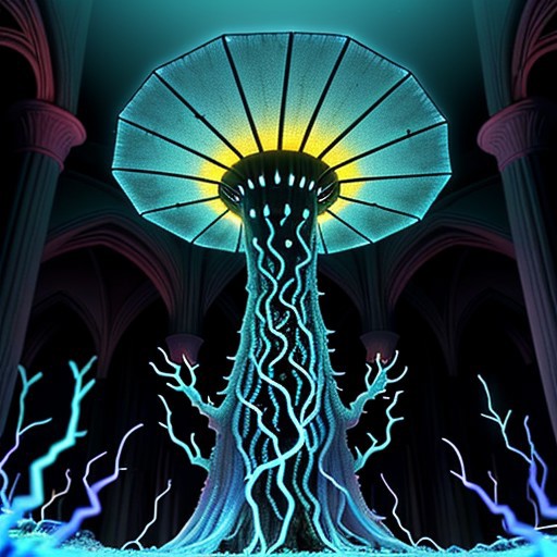 Create a 3 minutes video for YouTube about Kleptoparasi King of all Calamities An eerie mushroom cathedral, its bioluminescent interior casting a soft, ethereal glow. The walls and ceiling are lined with cracked, glowing blue veins that mimic the intricate patterns of shattered glass, hinting at the presence of archaea and bacteria. In the center of this mystical space, a Kleptoparasi is a mixes of archaea/bacteria/mushroom/parasite/fungi a living virse humanoid entity, stands tall with its translucent bioluminescence glass like skin revealing a complex network of neon glowing veins in the same electric blue hue. Its eyes are two piercing dots of light that seem to pulse in sync with the surrounding fungal structure. The creature wears tattered robes made from what appear to be discarded membrane scraps, giving it an otherworldly, yet strangely organic appearance. As it steps into the heart of the cathedral, its veins flare up in a symphony of colorful flames—purple, teal, yellow, green, red, orange, and pink—manifesting its Kleptoparasitism Striker form. Its hands are now engulfed in a fiery dance of multiple hues, each flame representing a different type of energy stolen from various hosts. The parasite's posture is one of determination, its eyes focused on the horizon of the mushroom forest beyond, symbolizing its relentless pursuit of new life to infect and adapt to. The scene is a mesmerizing blend of beauty and horror, showcasing the delicate balance of life