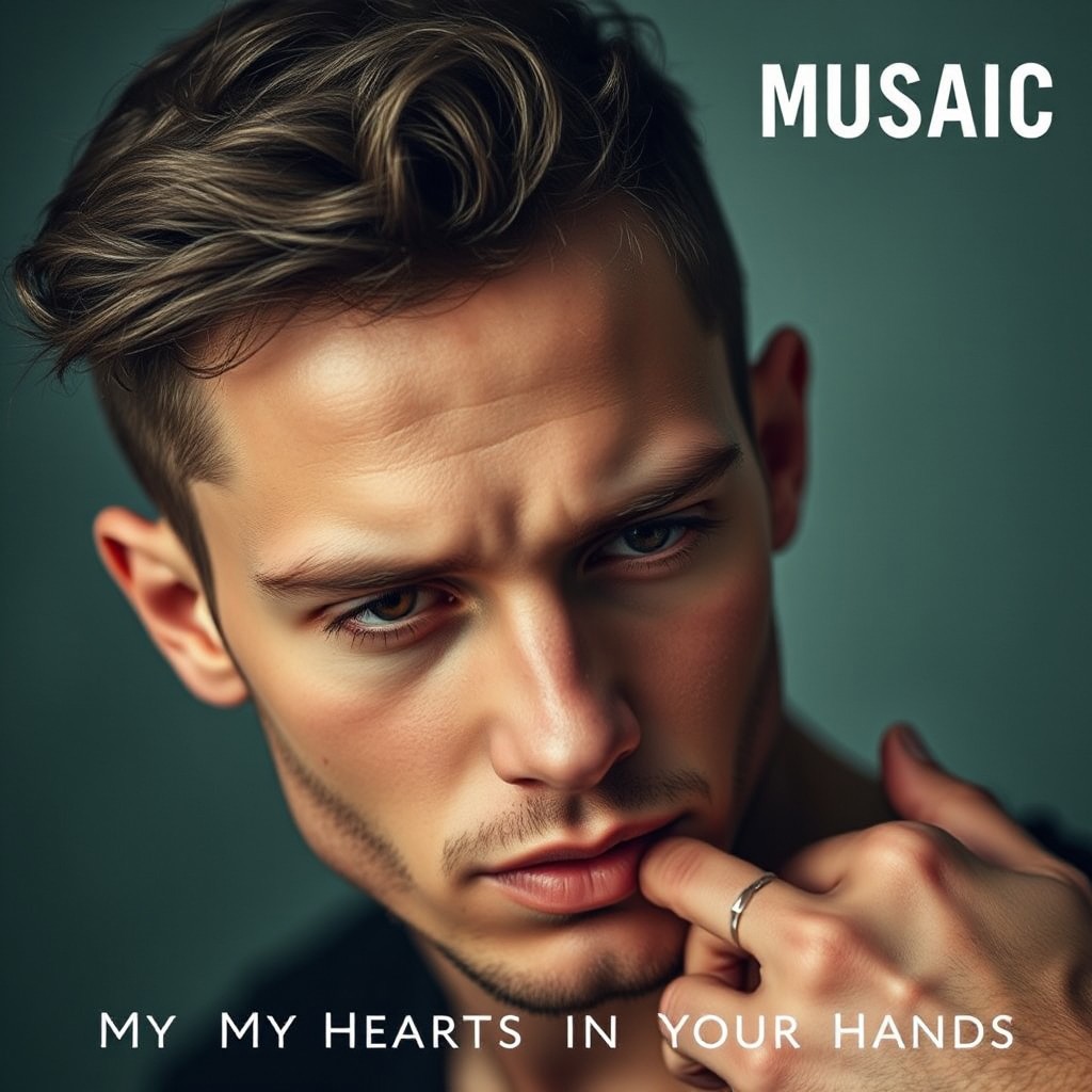 high quality design aesthetics, soulful, introspective, emotive, detailed, pop album cover, young white man, artist name "MUSAIC", album title "My Heart's In Your Hands"