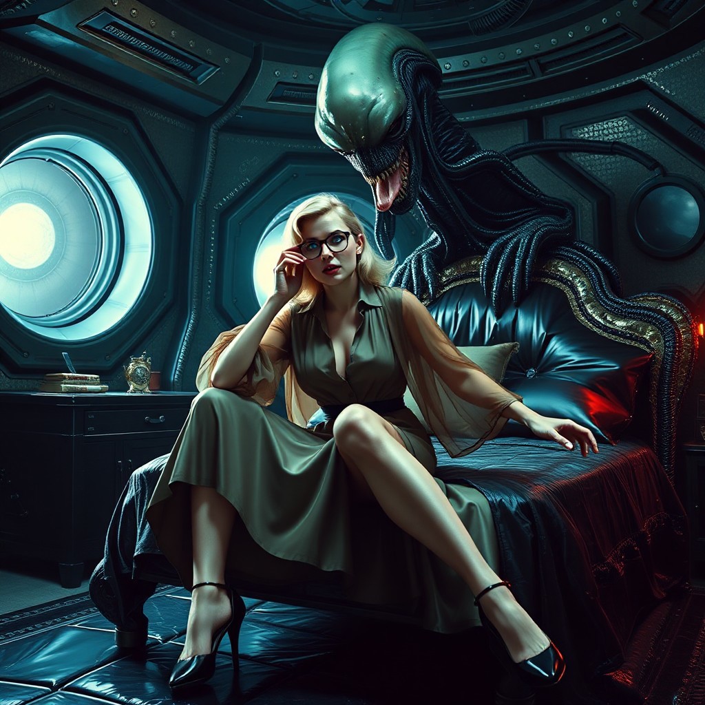 Terrified blonde secretary, clad in a 1950s flowing open transparent chiffon blouse, her glasses askew, her satin skirt lifted, her legs spreaded wide open, knees bent, hands tied to headboard, glossy high heels a stark contrast to her distress, as a towering, human-like alien in a glossy black slime baroque robe looms over her, its long fingers grasping her nipples, its tongue extended, tasting the terror on her cheek. The alien's bioluminescent eyes gleam with an unholy intensity as it subjects her to a twisted examination on a weird, biomechanical bed with steel restraints under tentacle canopy, its black glossy foil pillow reflecting the faint glow of the whorish boudoir. The walls appear to be alive, covered in a pulsing, iridescent slime, while giant observation portholes gaze in like empty eyes, as if the very darkness of space itself is watching this horrific scene unfold. Inspired by the dark, industrial sci-fi of H.R. Giger, the eerie, atmospheric lighting of Zdzisław Beksiński, and the surreal, biomechanical nightmares of Francis Bacon.