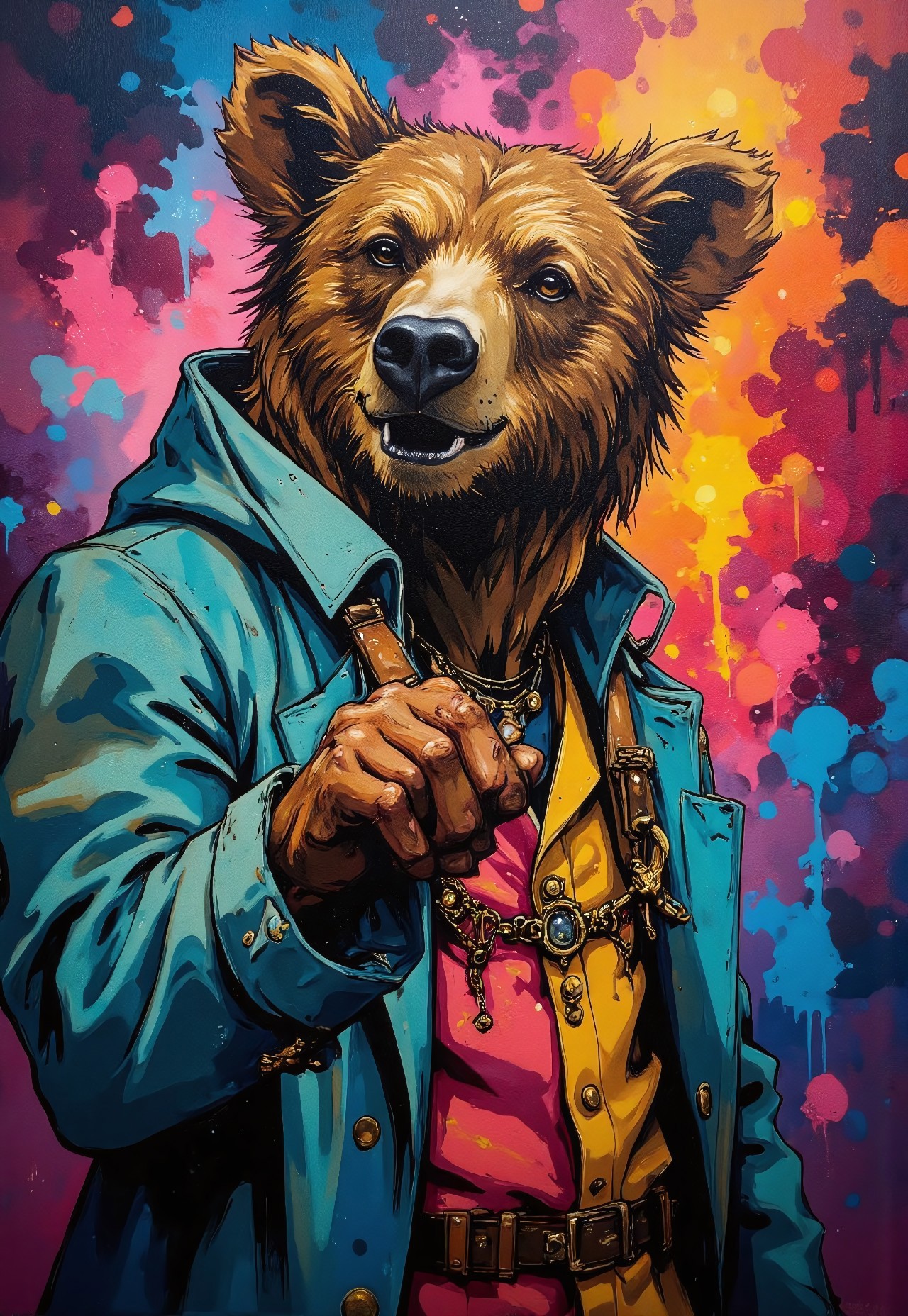 ArsMJStyle, impressionism, anime art. This is a vibrant, stylized digital drawing set against a dramatic, abstract background, of an anthro bear striking a pose. The bear is wearing fabulous outfit in colors of brown bear rainbow, and he has a cheeky gay grin on his face, slightly displaying his ursine teeth., vibrant saturated gloomy colors, bokeh, highly detailed painterly aesthetics, high contrast of shadow and light, upper body medium shot.