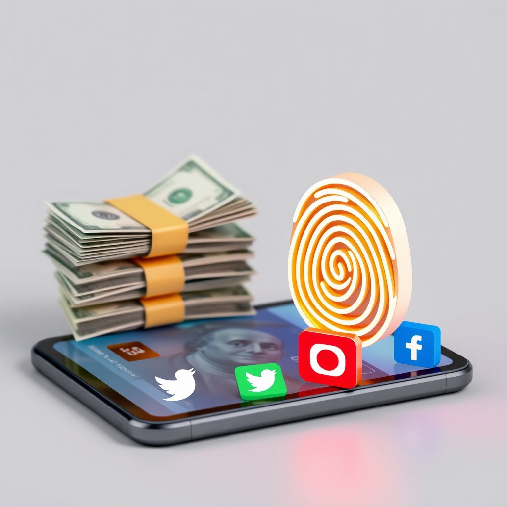A 3D fingerprint logo next to money and social media icons. This is a professional and realistic image of an advertising company featuring a fingerprint logo on a social media platform. The background is neutral.