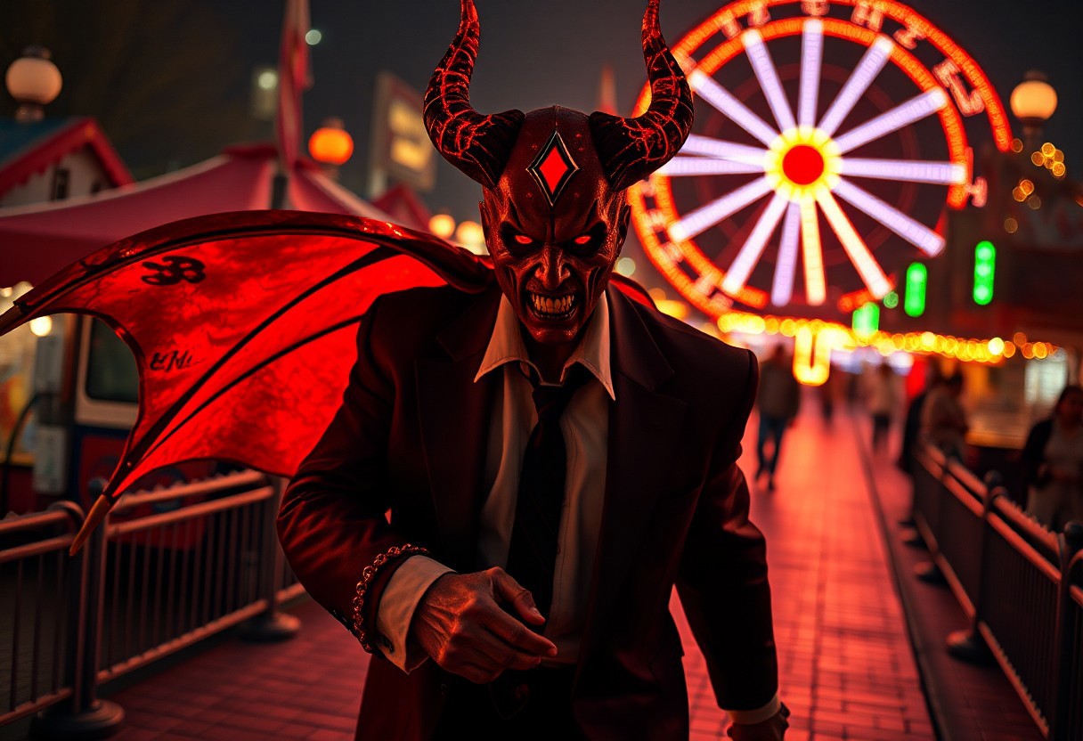 "Create a highly detailed, micro-focused image for the Pexels contest, featuring Florida Governor Ron DeSantis as a Satan-like from Ice Age Panic. Utilize directional path tracing and the golden ratio to create depth and realism. Set in a theme park at night, with evil glowing crackling lighting magic to emphasize an eerie, hellish atmosphere from 1744667075.1807618. Add a sense of motion and suspense as Satanic DeSantis embarks on an ominous path, capturing the evocation of the scene."