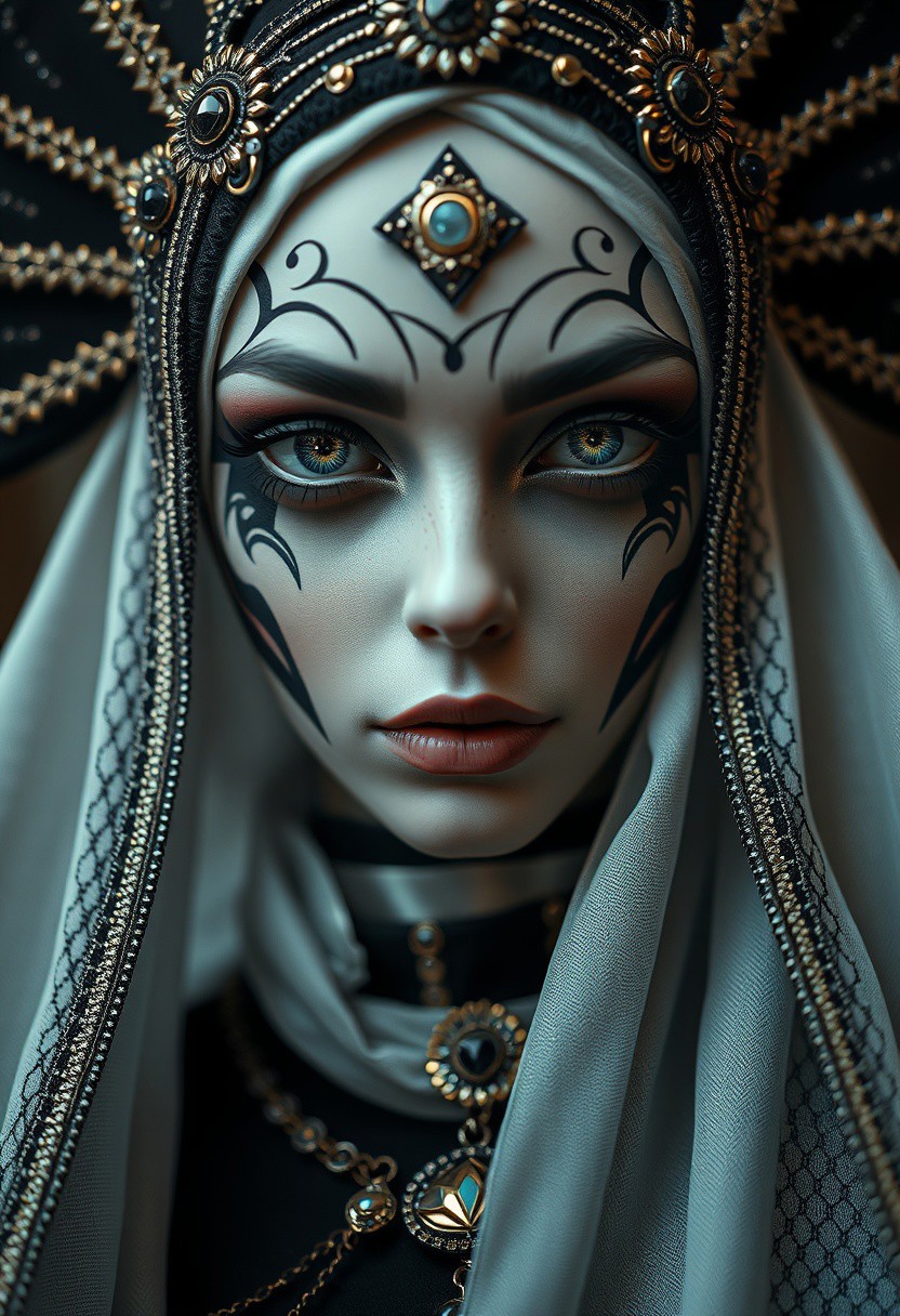 hyper-realistic, photography, highly intricate detailed, female pope, shining facet eyes, gothic style, in galactic form, surreal, masterpiece, low-angle, soft focuss, full body