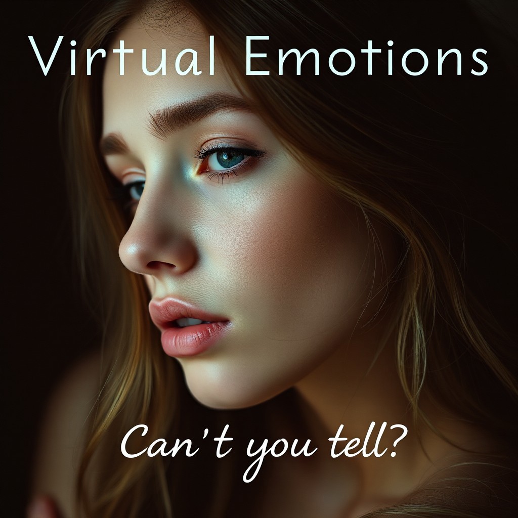high quality design aesthetics, soulful, introspective, emotive, detailed, pop album cover, young white woman, artist name "Virtual Emotions", album title "Can't you tell?"
