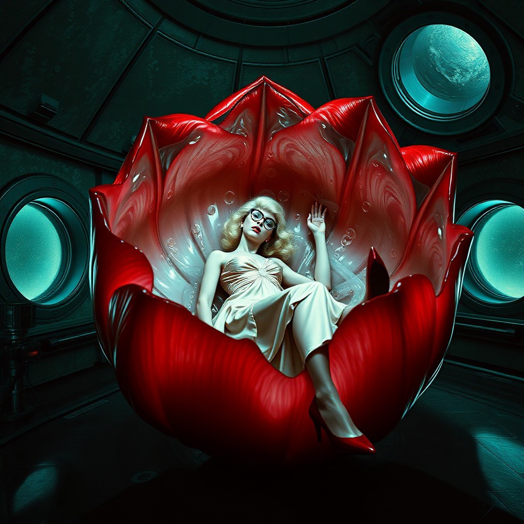 Terrified blonde damsel, clad in a 1950s long delicate silk slip, her glasses askew, laying encased in center of giant carnivorous flower closed bud, ensnared in thin crystal slime sticky liquid, struggling to break free, surrounded by giant glossy transparent petals reflecting the faint glow of the weird alien laboratory. Glossy fluffy high heels a stark contrast to her distress, thin tentacles covering her body inside the bud . the walls appear to be alive, covered in a pulsing, iridescent slime, while giant observation portholes gaze in like empty eyes, as if the very darkness of space itself is watching this horrific scene unfold. Inspired by the dark, industrial sci-fi of H.R. Giger, the eerie, atmospheric lighting of Zdzisław Beksiński, and the surreal, biomechanical nightmares of Francis Bacon.