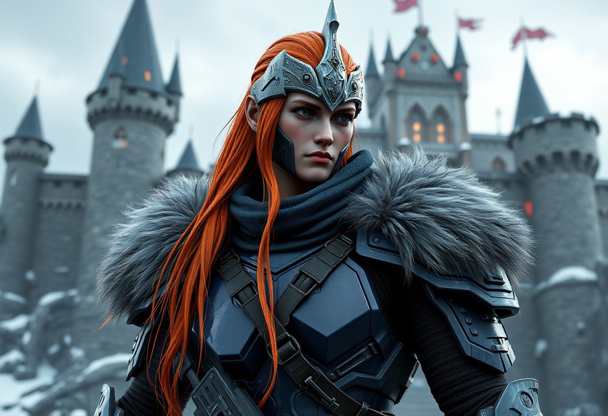 A highly detailed, lifelike depiction of a Cyber Soldier from Darkworld, adorned in navy blue armor and adorned with fur shoulder pads, standing in front of a Castle of Dark Illusions. The soldier, with long red-orange hair and a light grey crown, draws inspiration from Samuel F.B. Morse and Mór Than. The artwork is designed for a game, following the golden ratio and showcasing terracotta shaders. Created with Octane Render, it embodies the styles of H.R. Giger, Charles Marion Russell, and Simon Stalenhag, aiming to trend on ArtStation.