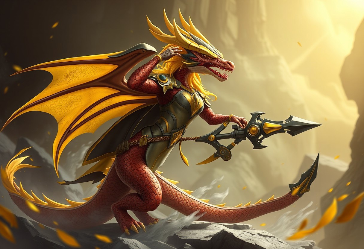"Create a high-definition, lifelike image of a Dragoness, the Wicked Knight, set against a Machine Duplication background. Incorporate a saluting cyclops and yellow magic theme. Depict the character in a serpentine pose, with a booster and mono-yellow accents. The image should be polished, suitable for an app icon or official store photo. Lighting and details should follow the golden ratio, aiming for a marvelous, intricate result, featured on ArtStation."
