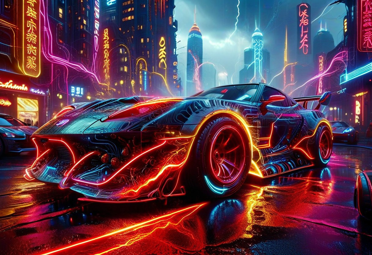 ((90's retrofutursim)), lthndrtrl, psychedelic world 90's collide with a futuristic vision. blend of retro and futuristic aesthetics, futuristic 90's import tuner sports car made of red and golden lightning thunder trails:1.5, Blade Runner spinner, extremely detailed neon lights, red neon lights, driving through a futuristic city street,
