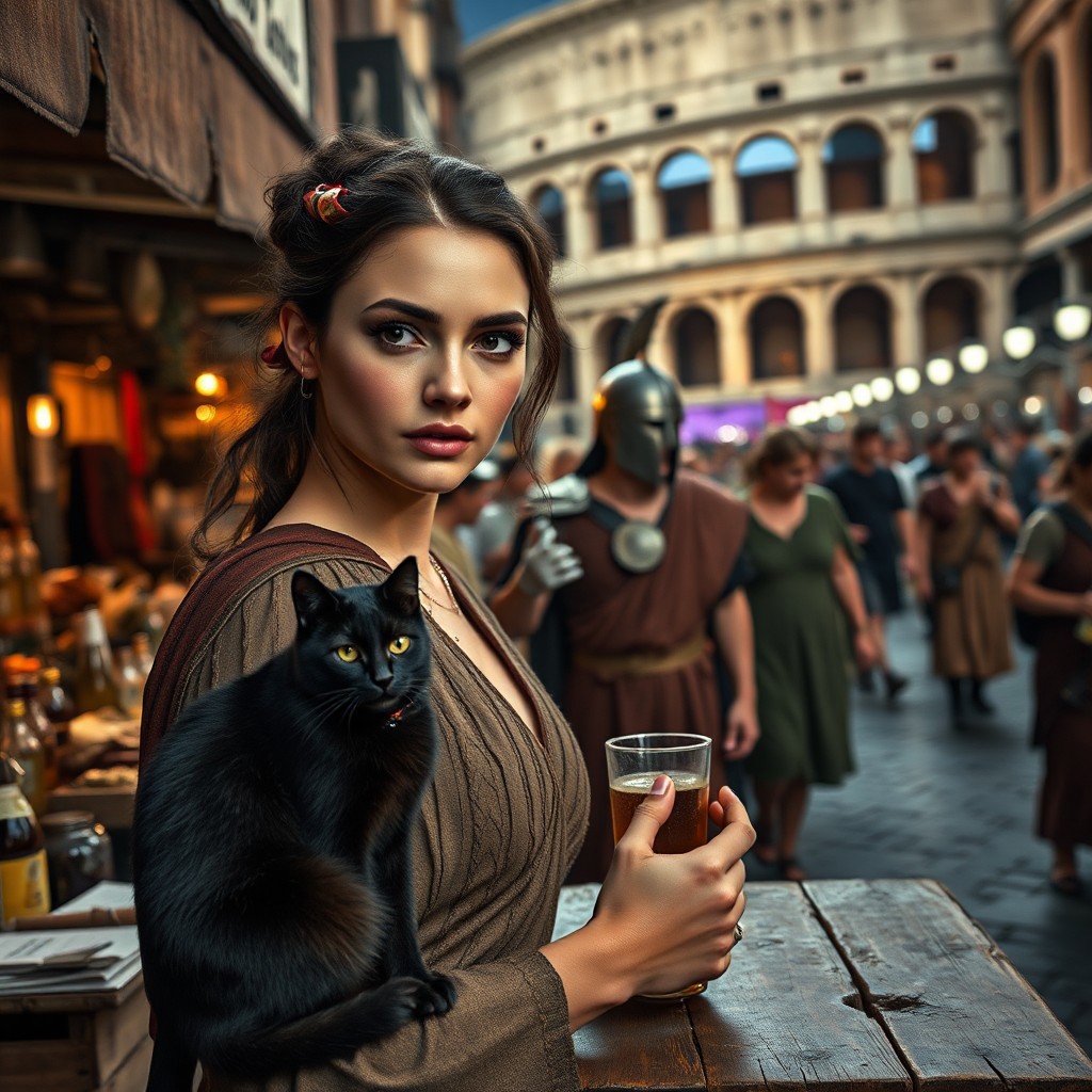 Setting is a 1st century Roman Empire market in Rome at night, the market is comprised of street vendors selling robot parts, food, weapons, and animals. Everyone and everything in the image is appropriate for a scene from Ancient Rome, People wearing Roman clothing are walking through the street market shopping and eating, A sleek black cat with red collar sits on a cluttered wooden table at a kiosk selling beverages and food, Behind the table is a merchant selling beverages and food, (((a beautiful woman, 24 years old is standing in the foreground, the woman facing the viewer with a cup of alcohol beverage in her hand. Her eyes are beautiful and focused on the viewer, she has an expression of interested curiosity))), the sleek black cat with red collar is sitting on the table and watching the beautiful woman, Roman Soldiers are walking behind the beautiful woman, one of the solders turns to look at the beautiful woman with the cat, many people are walking by in the busy street market, the woman is dressed in high fashion Roman Empire clothing with an alluringly sexual, but traditional roman aesthetic. The woman's hair is elegantly tied up with a ribbon. Artistic ancient Roman aesthetic, dynamic perspective, (((overall architectural aesthetic is Ancient Rome in 1st Century Roman Empire era))). Epic image that elicits a feeling of wonder and awe, Rome Coliseum Roman Forum architecture in background,