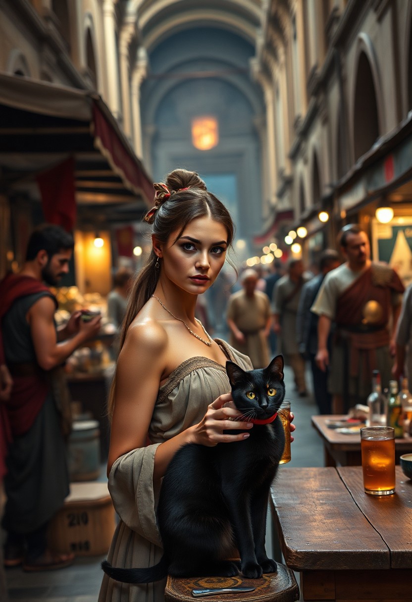 Setting is a 1st century Roman Empire market in Rome at night, the market is comprised of street vendors selling robot parts, food, weapons, and animals. Everyone and everything in the image is appropriate for a scene from Ancient Rome, People wearing Roman clothing are walking through the street market shopping and eating, A sleek black cat with red collar sits on a cluttered wooden table at a kiosk selling beverages and food, Behind the table is a merchant selling beverages and food, (((a beautiful woman, 24 years old is standing in the foreground, the woman facing the viewer with a cup of alcohol beverage in her hand. Her eyes are beautiful and focused on the viewer, she has an expression of interested curiosity))), the sleek black cat with red collar is sitting on the table and watching the beautiful woman, Roman Soldiers are walking behind the beautiful woman, one of the solders turns to look at the beautiful woman with the cat, many people are walking by in the busy street market, the woman is dressed in high fashion Roman Empire clothing with an alluringly sexual, but traditional roman aesthetic. The woman's hair is elegantly tied up with a ribbon. Artistic ancient Roman aesthetic, dynamic perspective, (((overall architectural aesthetic is Ancient Rome in 1st Century Roman Empire era))). Epic image that elicits a feeling of wonder and awe, part of the interior is visible,