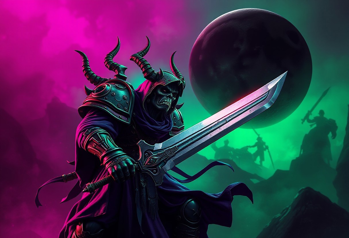 "Create a highly detailed, lifelike image of an epic Chaos Marine with a sword, inspired by the end times and the unholy abomination known as the Antipodeans. Utilize a dramatic pink and green lighting, with a giant black moon looming in the background. The Marine should be adorned in dark purple robes, fitting for an Instagram influencer. Ensure the image is HD quality and follows the golden ratio for optimal aesthetics. Perfect for a store website or display on ArtStation and CG Society."