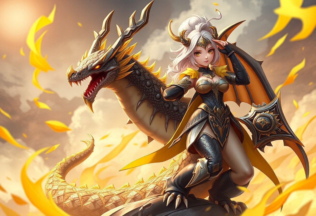 "Create a high-definition, lifelike image of a Dragoness, the Wicked Knight, set against a Machine Duplication background. Incorporate a saluting cyclops and yellow magic theme. Depict the character in a serpentine pose, with a booster and mono-yellow accents. The image should be polished, suitable for an app icon or official store photo. Lighting and details should follow the golden ratio, aiming for a marvelous, intricate result, featured on ArtStation."