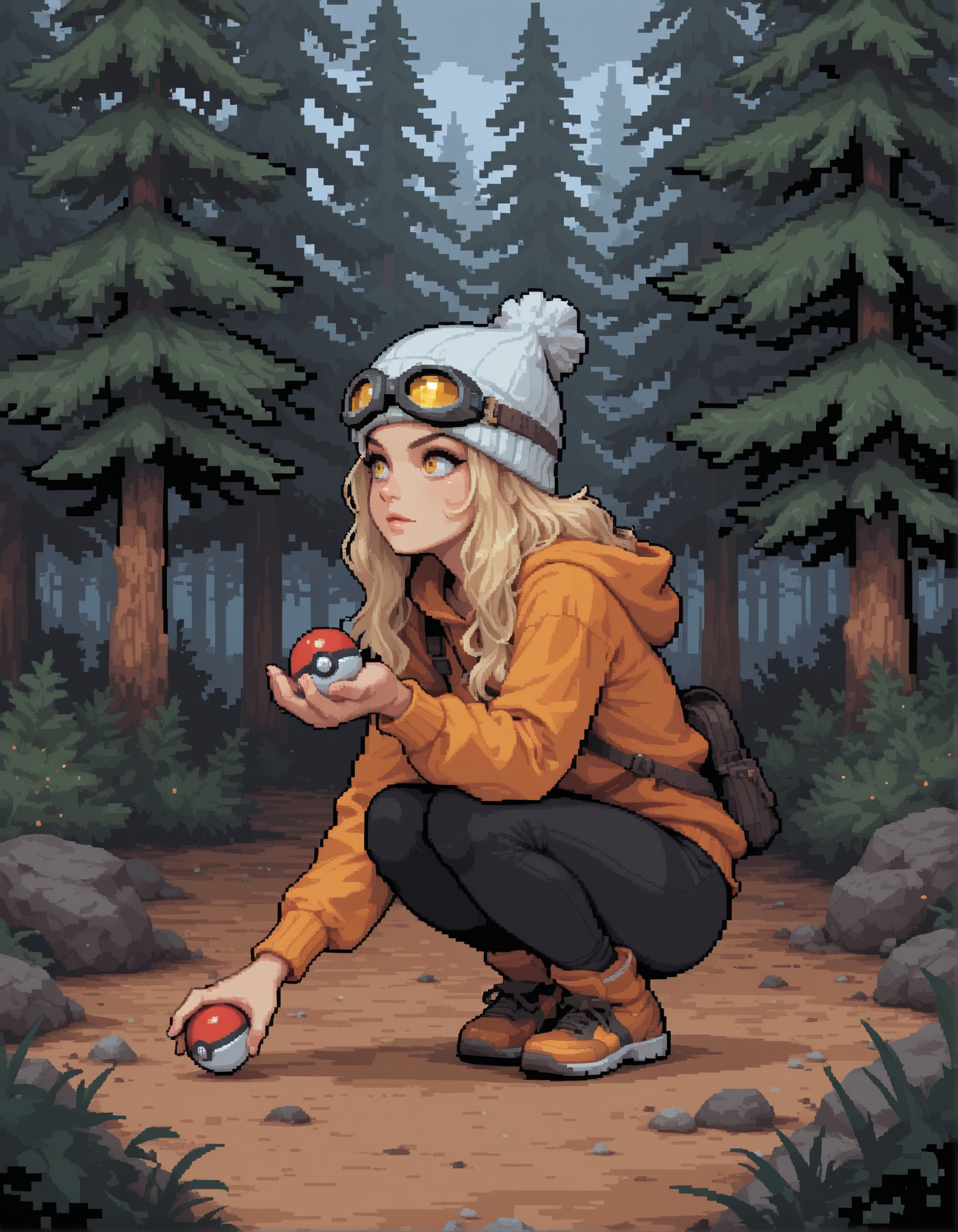 masterpiece, amazing quality, absolutely eye-catching, absurdres, newest, 1girl, woman, beanie, curtained hair, light blonde hair, yellow eyes, goggles, pine tree forest, pixel art, simple background, full body , holding poke ball, side profile squat