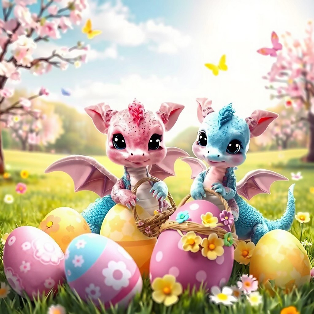 Create a bright and joyful Easter-themed image with cute baby dragons instead of the traditional Easter bunnies. Baby dragons should be small, with big eyes and soft fur, in pastel colors — pink, blue, yellow and green. They appear among bright Easter eggs decorated with patterns and flowers. The background depicts a spring landscape with blooming trees and green lawns, creating a festive atmosphere. The sun is shining in the sky, and butterflies are fluttering around. Baby dragons can hold small baskets of eggs in their paws or hide behind them, creating a playful and cheerful atmosphere. The lighting should be soft and warm, creating light tones in the image.