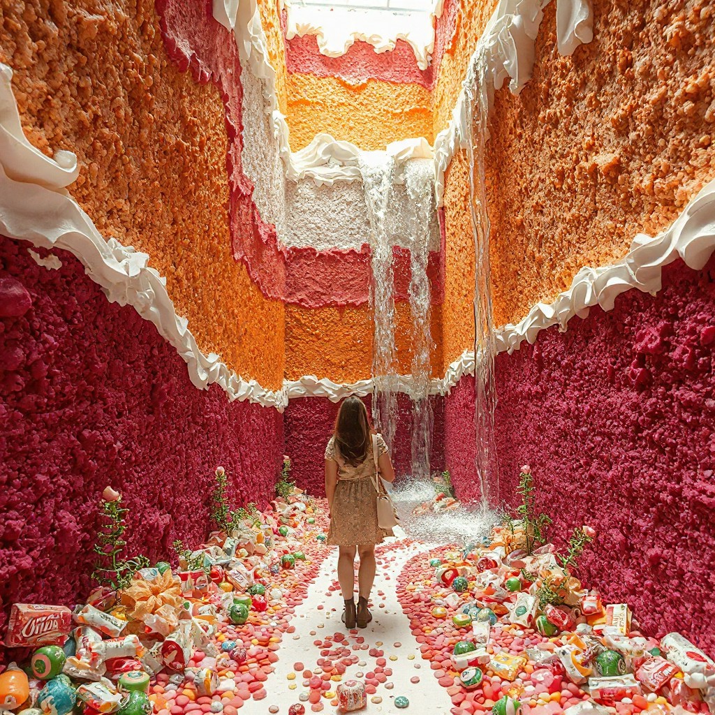 at the bottom of the multi color cake valley. The valley is made from cake and melting cream. between towering, huge cake and huge topping cream. canyon of giant layered cake. plants created from sparkling candies. pebbles of candy spread along the path. Waterfall of wine flowing out of giant bottle. a woman approaching wall of cake and tasting. a woman facing toward viewer.
