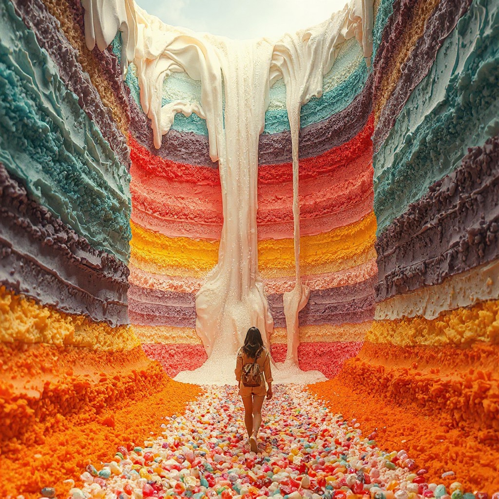 at the bottom of the multi color cake valley. a woman walking approaching wall of cake and tasting. toward viewer. The valley is made from cake and melting cream. between towering, huge cake and huge topping cream. canyon of giant layered cake. bush created from sparkling candies. pebbles of candy spread along the path. Waterfall of wine flowing out of giant bottle.