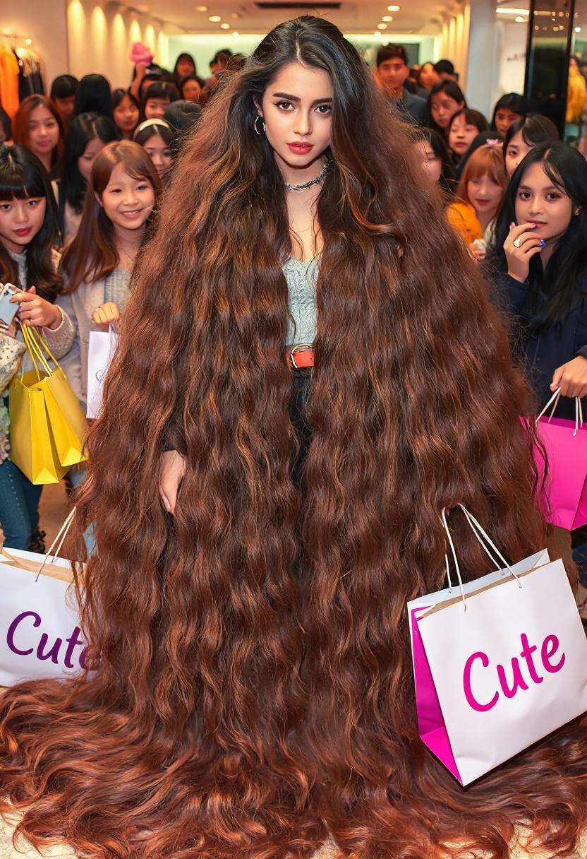 An Instagram photograph of a beautiful, extremely long-haired influencer shopping. Her hair is so voluminous that it nearly envelops her completely and it is spread around the floor at her feet. She has many friends around her, holding bags from various stores, with "Cute" written on one of them. The background features several girls adding to the cheerful atmosphere. This scene captures vibrant colors and lively expressions, showcasing fashion as part of daily life for these characters