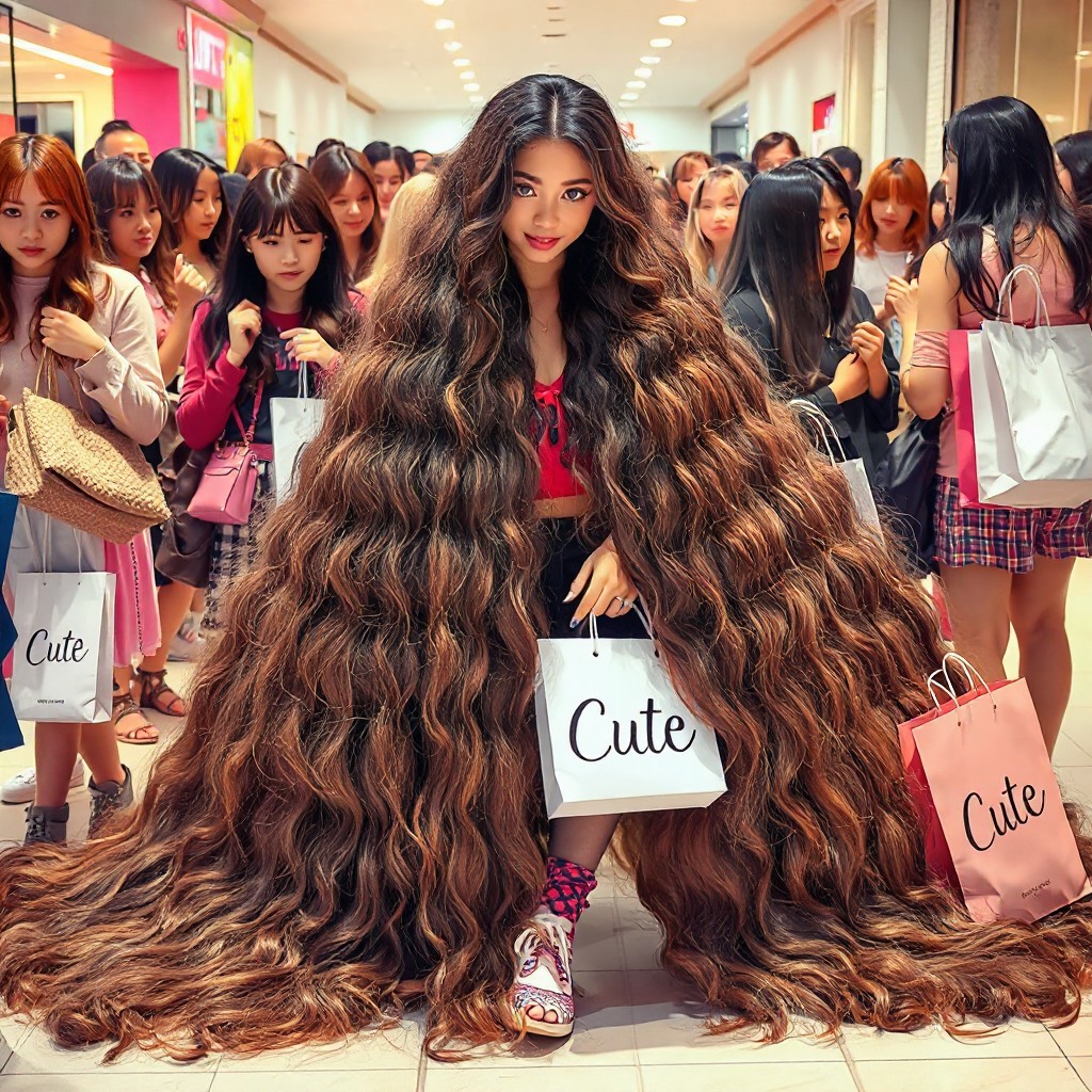 An Instagram photograph of a beautiful, extremely long-haired influencer shopping. Her hair is so voluminous that it nearly envelops her completely and it is spread around the floor at her feet. She has many friends around her, holding bags from various stores, with "Cute" written on one of them. The background features several girls adding to the cheerful atmosphere. This scene captures vibrant colors and lively expressions, showcasing fashion as part of daily life for these characters