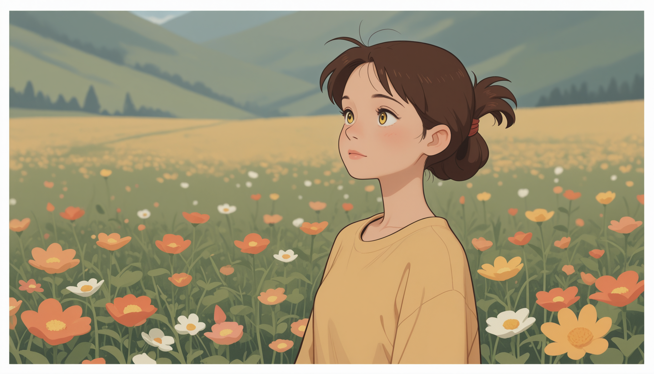 masterpiece, highest quality, very aesthetic, absurdres, 1girl, woman, folded ponytail, brown hair, yellow eyes, meadow of flowers, white border, outlined, studio_ghibli , m1nma_sty, minimalistic