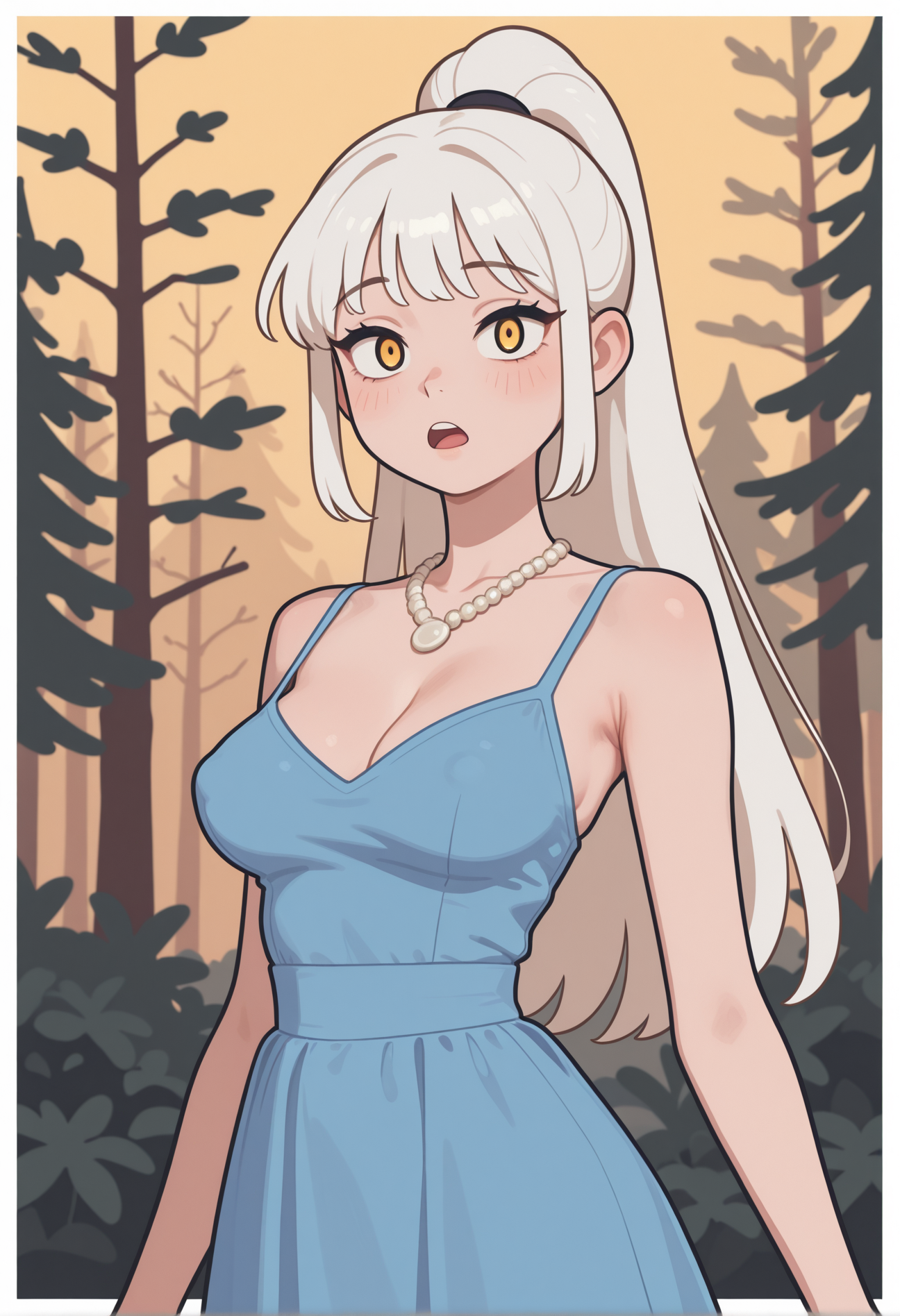 masterpiece, best quality, very aesthetic, absurdres, newest, highest quality, 1girl, perky_breasts, mommy figure, blue dress, platinum ponytail, messy bangs, demon eyes, thin waist, open_mouth, looking_at_viewer, upper_body, necklace, yellow_background, trees in background, dynamic pose, cowboy shot, golden_hour, deep_shadows, white border, outlined, m1nma_sty, minimalistic