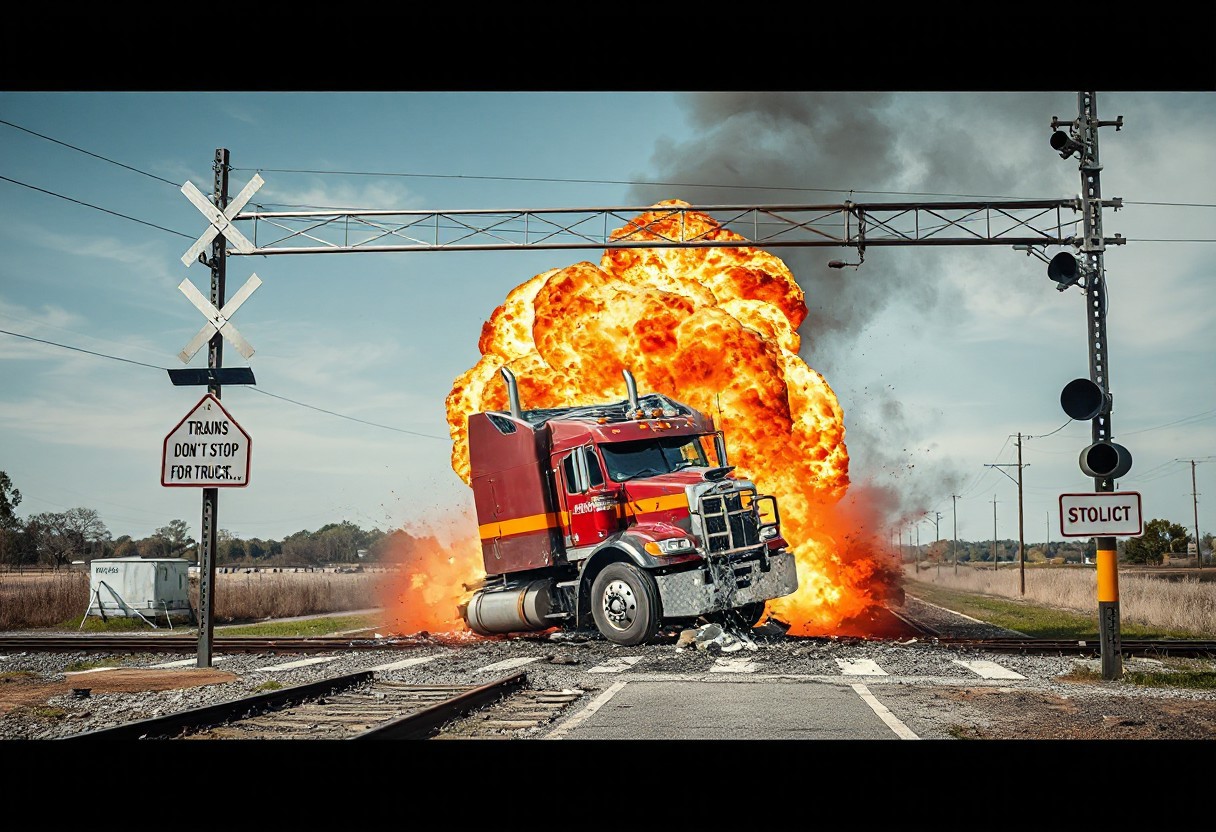 A railway crossing, a truck got stuck on the crossing, a freighttrain colliding with the truck, breaking the truck in thousand pieces, the train and the truck go up in a big explosion. A sign reads : "Trains don't stop for trucks....".