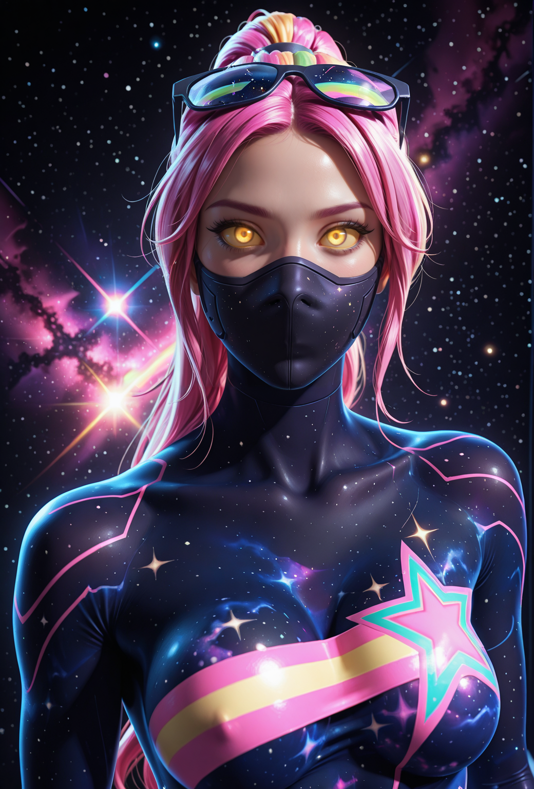 masterpiece, high_quality, highres, depth_of_field, subject_focus, 8K, solo, <lora:Galaxia:0.7> galaxia, glow eyes, yellow eyes, pink hair, ponytail hair, universe bodysuit, pink star on chest, rainbow on chest, mask, glasses over head, pink details, strand of green hair, stare, looking at viewer, close up, portrait, face mask, large breasts, dynamic angle, dutch angle, galaxy background, yellow sclera, glowing sclera, glowing eyes,