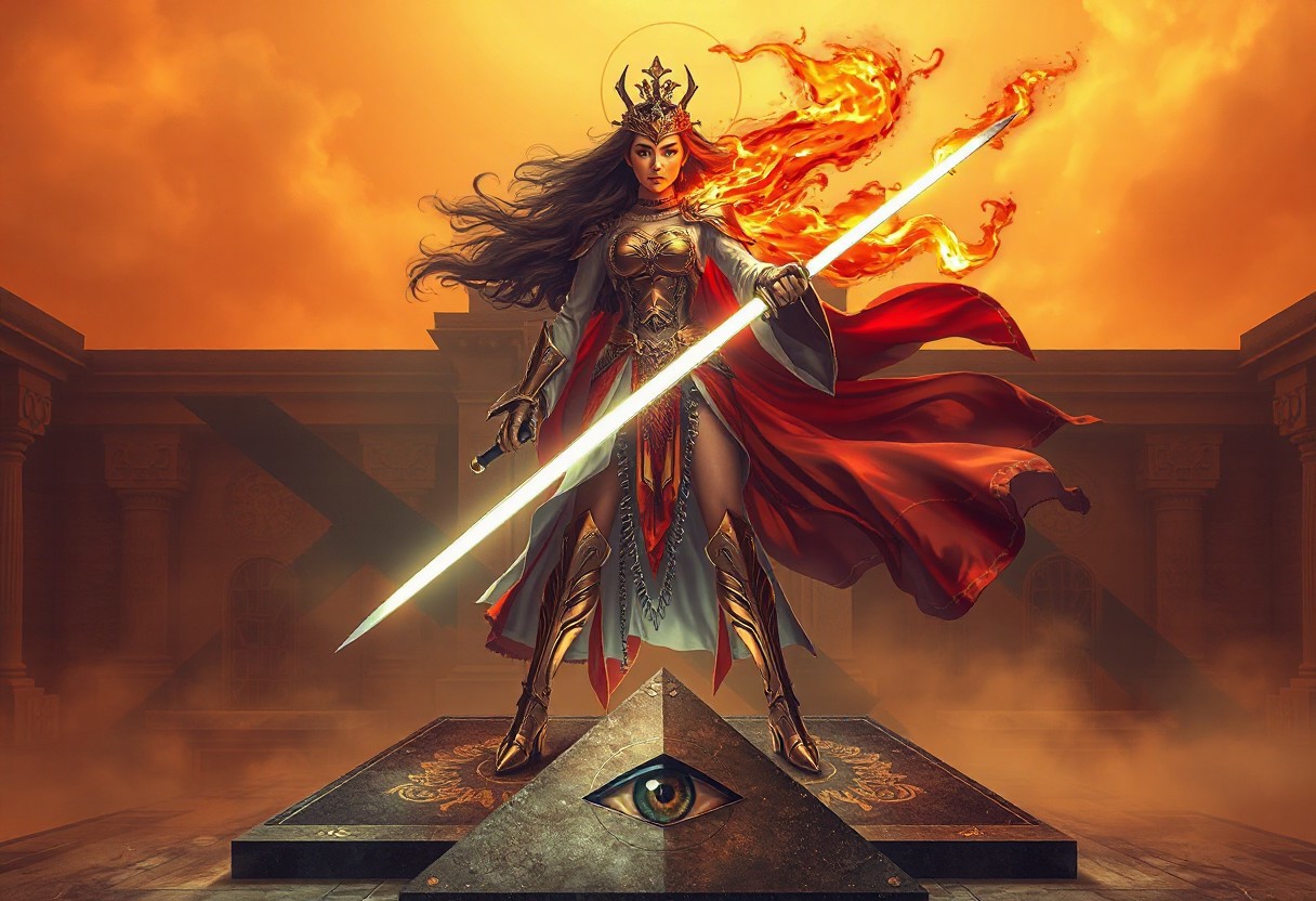 A detailed, golden ratio composition of a Fire Princess, wielding swords, standing on a Chronomaly Pyramid Eye Tablet. She embodies the 80s art deco style with double cloth armor and a single solid body. The setting is an academy, the headmaster is armed with a colorized photon. The piece has a dramatic warm color palette and a standing pose. The style is dreamwave, inspired by artists like David Ligare and Earl Moran. The image is micro-detailed, suitable for 4k or 8k, aiming for a sharp, clean, and smooth finish.
