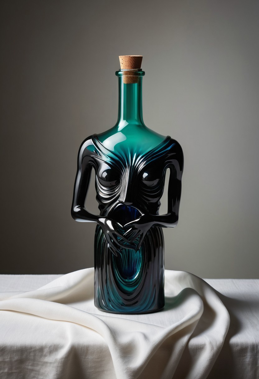 A glass bottle sits on a plain cloth in raking light — inside, instead of liquid, there’s a miniature figure painted in neon colors, arms outstretched, silently screaming from within the vessel., sculptural modernist photography, existential surrealism, psychological distortion, formal organic minimalism, grotesque expressionism, surrealist portraiture, rich black-and-white tonal depth, textural abstraction, emotional intensity, philosophical grotesque, isolated forms with internal rupture, tactile realism meets hallucinatory exaggeration, distorted facial features, meditative horror, metaphysical object study, photographic surreal expressionism, flesh as form and symbol, duality of clarity and chaos