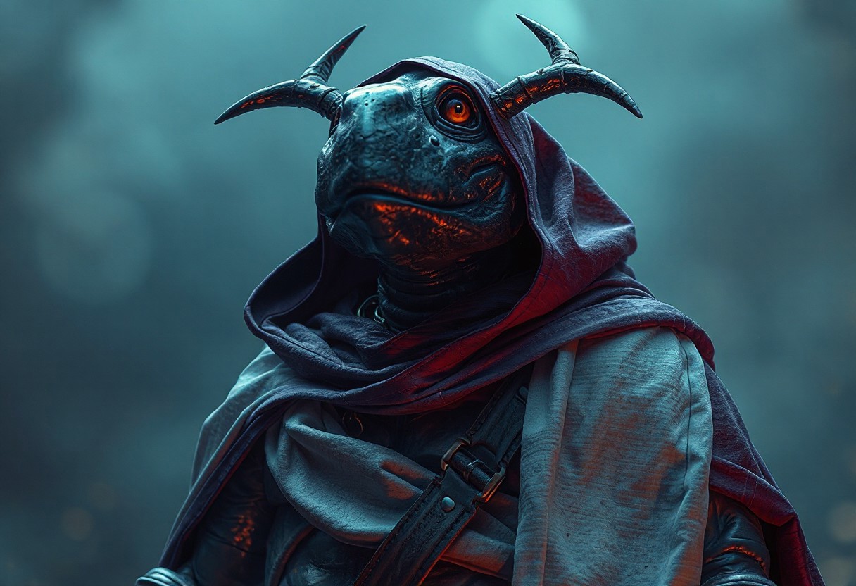"Create a high-quality, detailed portrait of an Infernity Archfiend turtle warrior on a Dark Factory of Mass Production, incorporating elements of MF Doom's blue chrome hippo-like body and a purple and white cloak. The warrior should have cryptoblades and no eyes, and be dressed in a cloak. Aim for a cinematic, ultra-high-detail model with a 8k scan, using techniques such as the golden ratio and rule of thirds. Draw inspiration from artists such as Artgerm, WLOP, and Metatron, and reference styles such as cell shading and apocalypse art."