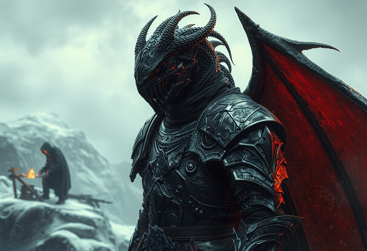 "Create a highly detailed, lifelike digital painting of a Headless Knight on a Freezing Point, with infinity blade armor and Black Rose Dragon features, inspired by DND and concept art from artists like Artgerm, Greg Rutkowski, and Alphonse Mucha. Incorporate anatomic details, a black shirt underneath the armor, and a blacksmith in the background. The style should resemble a smooth and sharp illustration, rendered with Octane or Unreal Engine, and showcasing a grainy, muted color palette, aiming for the golden ratio in composition. Desired output is HD, suitable for Artstation and a cinematic reveal, with a space camera footage feel."