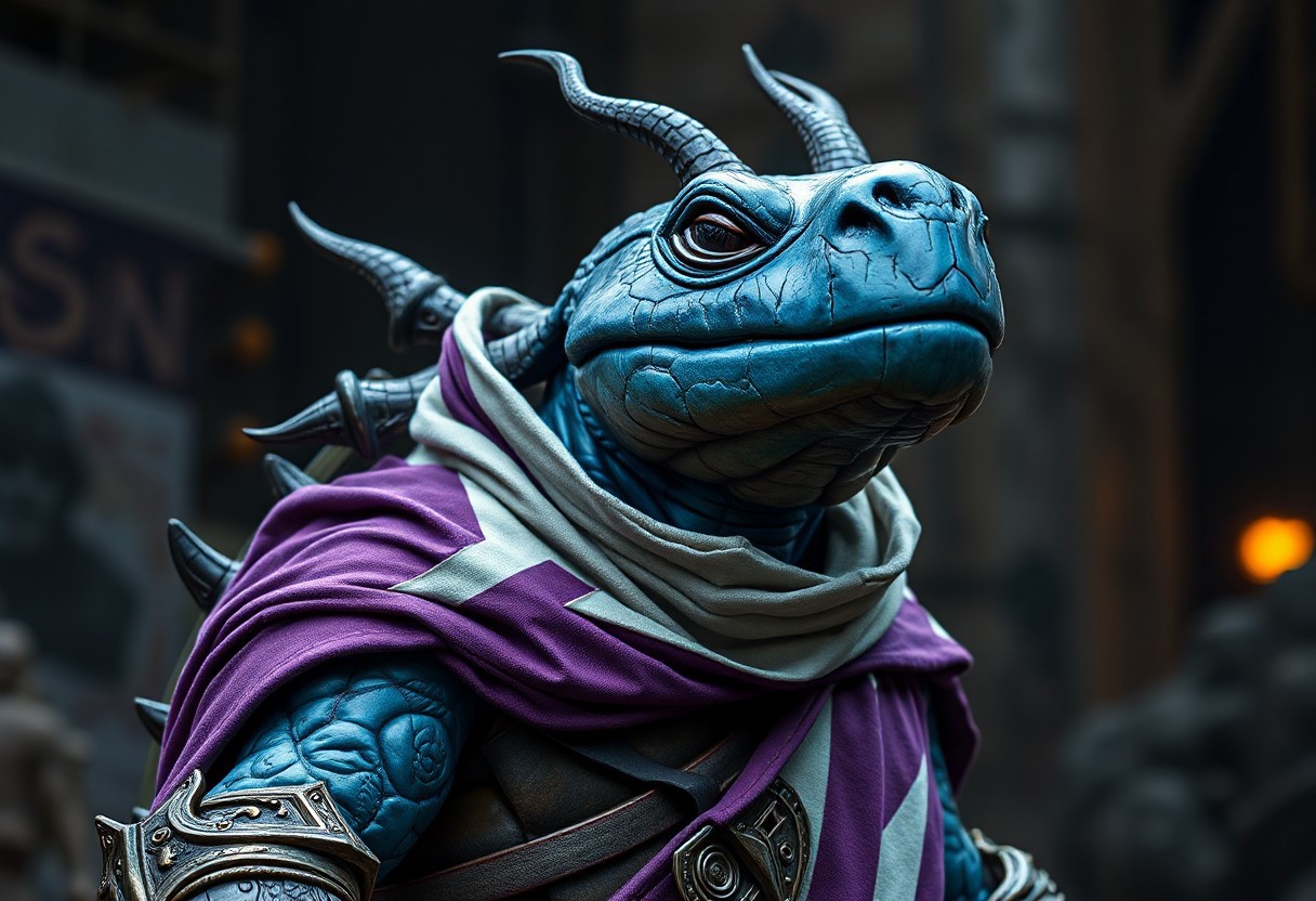 "Create a high-quality, detailed portrait of an Infernity Archfiend turtle warrior on a Dark Factory of Mass Production, incorporating elements of MF Doom's blue chrome hippo-like body and a purple and white cloak. The warrior should have cryptoblades and no eyes, and be dressed in a cloak. Aim for a cinematic, ultra-high-detail model with a 8k scan, using techniques such as the golden ratio and rule of thirds. Draw inspiration from artists such as Artgerm, WLOP, and Metatron, and reference styles such as cell shading and apocalypse art."