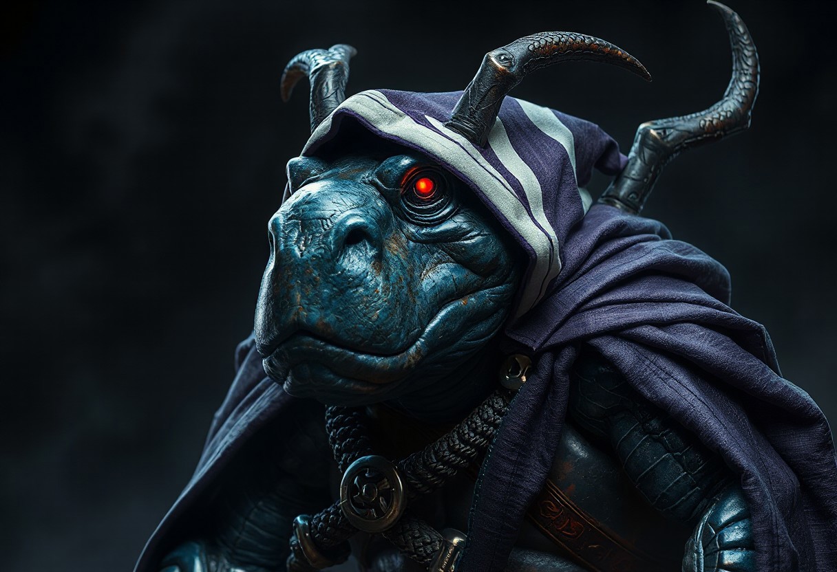 "Create a high-quality, detailed portrait of an Infernity Archfiend turtle warrior on a Dark Factory of Mass Production, incorporating elements of MF Doom's blue chrome hippo-like body and a purple and white cloak. The warrior should have cryptoblades and no eyes, and be dressed in a cloak. Aim for a cinematic, ultra-high-detail model with a 8k scan, using techniques such as the golden ratio and rule of thirds. Draw inspiration from artists such as Artgerm, WLOP, and Metatron, and reference styles such as cell shading and apocalypse art."
